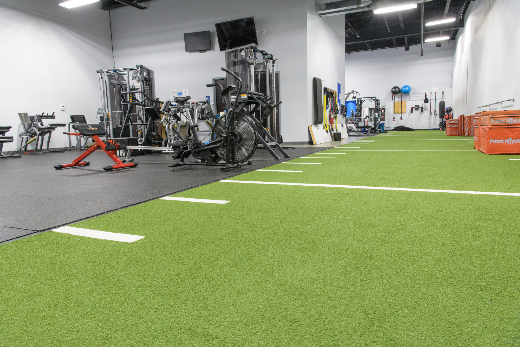 30 yards of turf, reinforced walls for medicine ball throwing, sleds, sandbags, and ropes